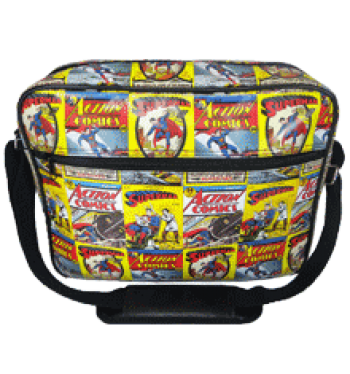 Superman Messenger Bag is made of faux leather with a satin finish. The bag has an interior zip compartments, strong jacquard canvas strap and retro studs the bottom of the bag.